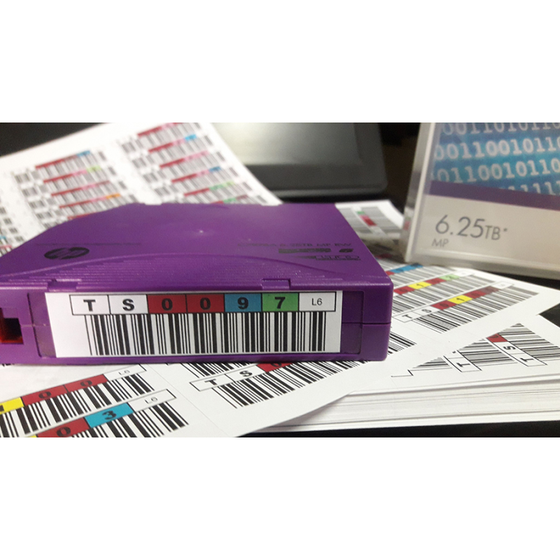 Etiquetas autoadhesivas troqueladas de códigos de barra para todas las normas LTO, generadas a demanda con prefijos y secuencias personalizadas.